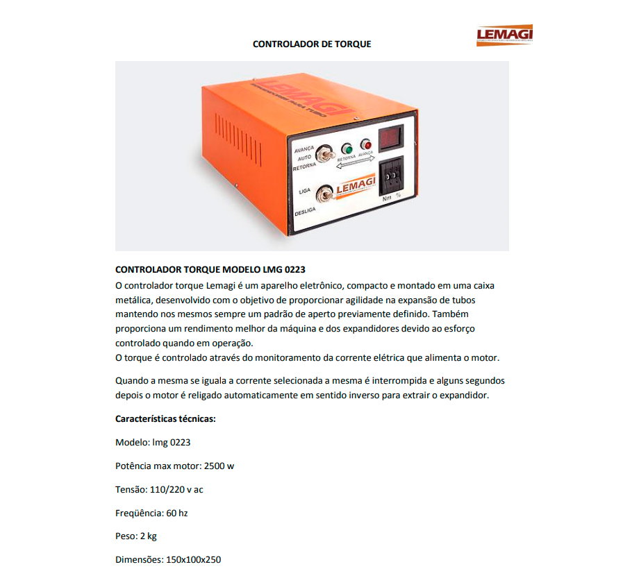O controlador torque Lemagi é um aparelho eletrônico, compacto e montado em uma caixa metálica, desenvolvido com o objetivo de proporcionar agilidade na expansão de tubos mantendo nos mesmos sempre um padrão de aperto previamente definido. Também proporciona um rendimento melhor da máquina e dos expandidores devido ao esforço controlado quando em operação.