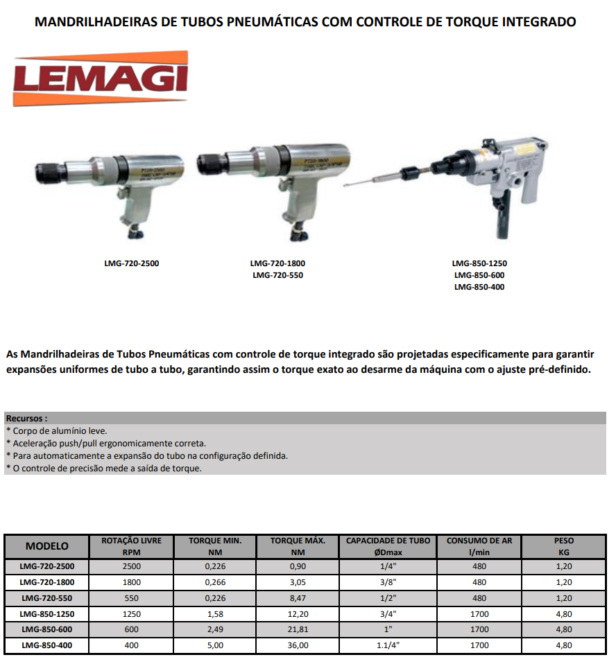MANDRILHADEIRAS DE TUBOS PNEUMÁTICAS COM CONTROLE DE TORQUE INTEGRADO